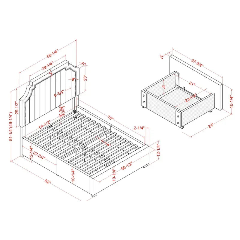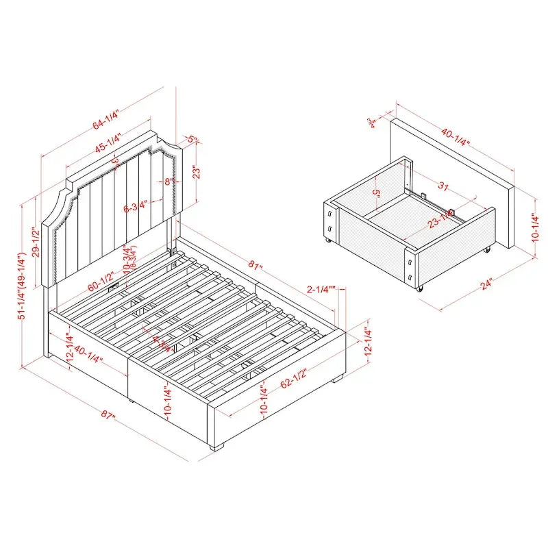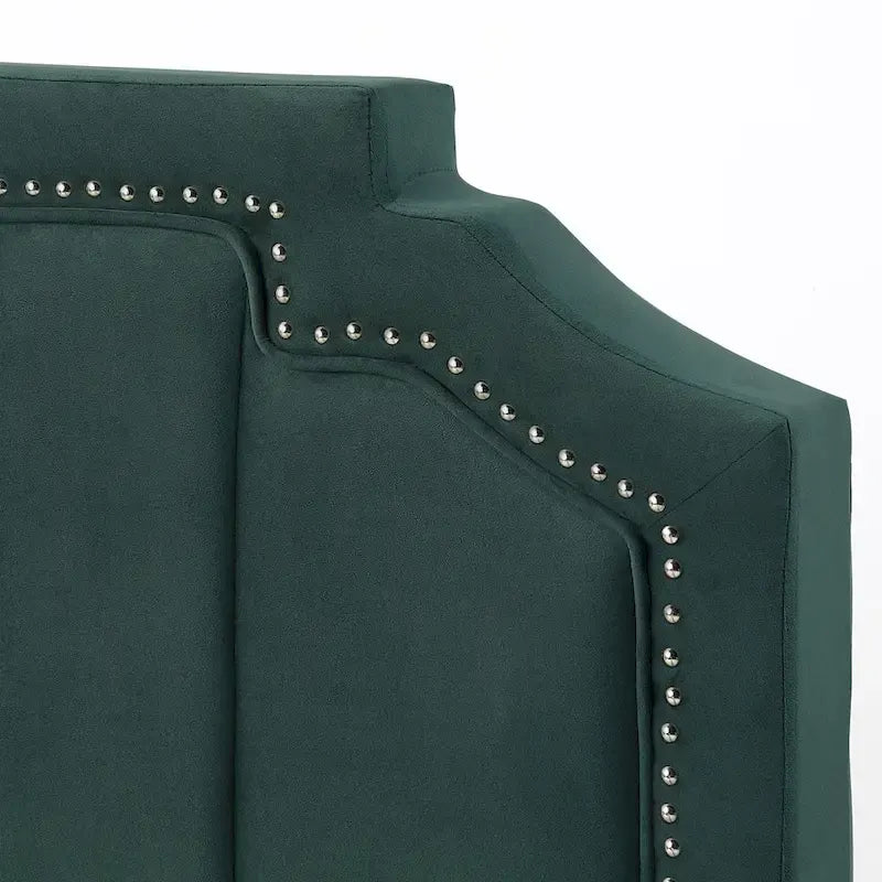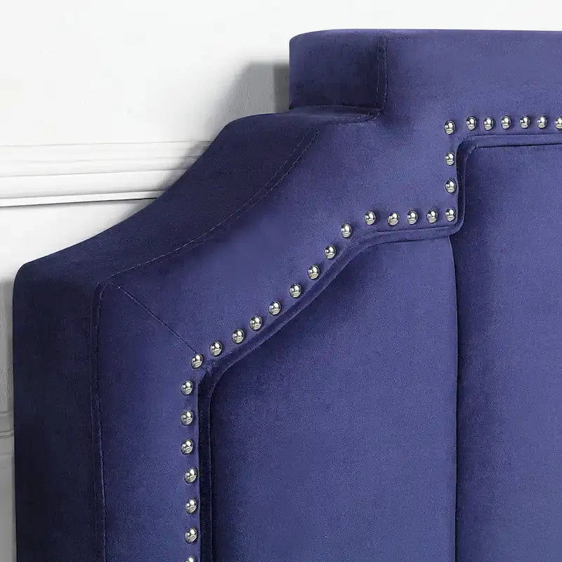 Un tissu doux et velouté et des clous décoratifs confèrent une élégance raffinée à ce lit contemporain et accueillant. Doté de tiroirs de rangement pour une fonctionnalité optimale, ce lit arbore une haute tête de lit aux angles découpés et aux rainures verticales qui ajoutent une touche de douceur.